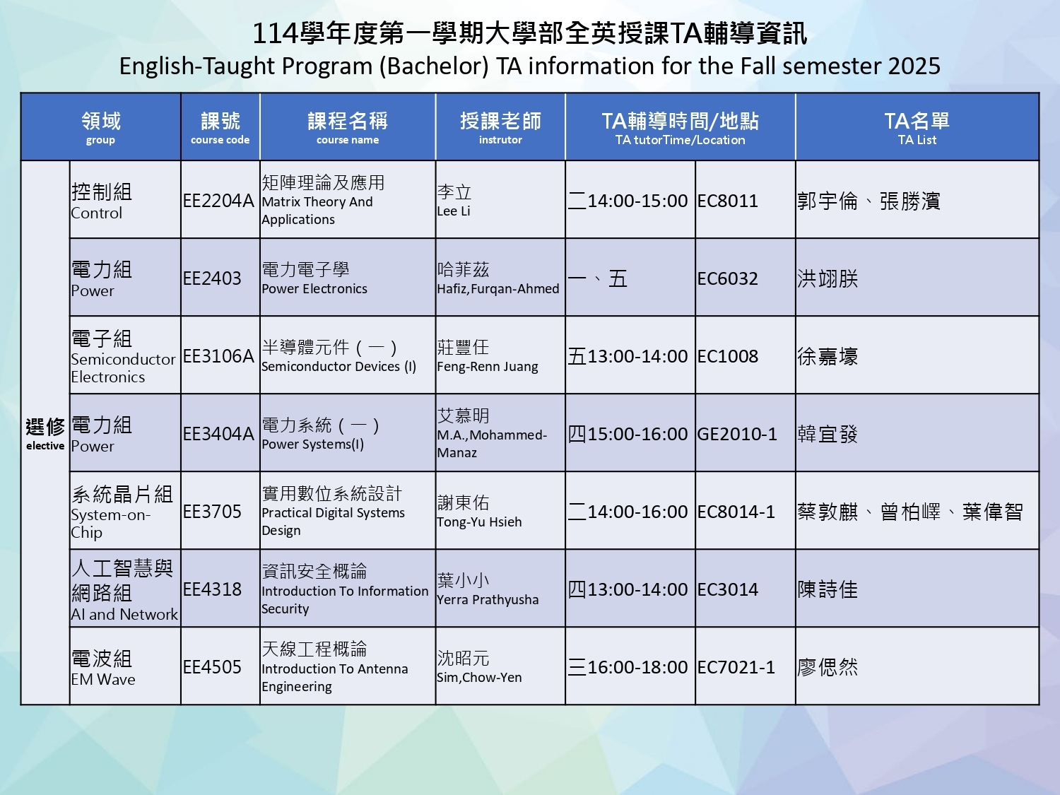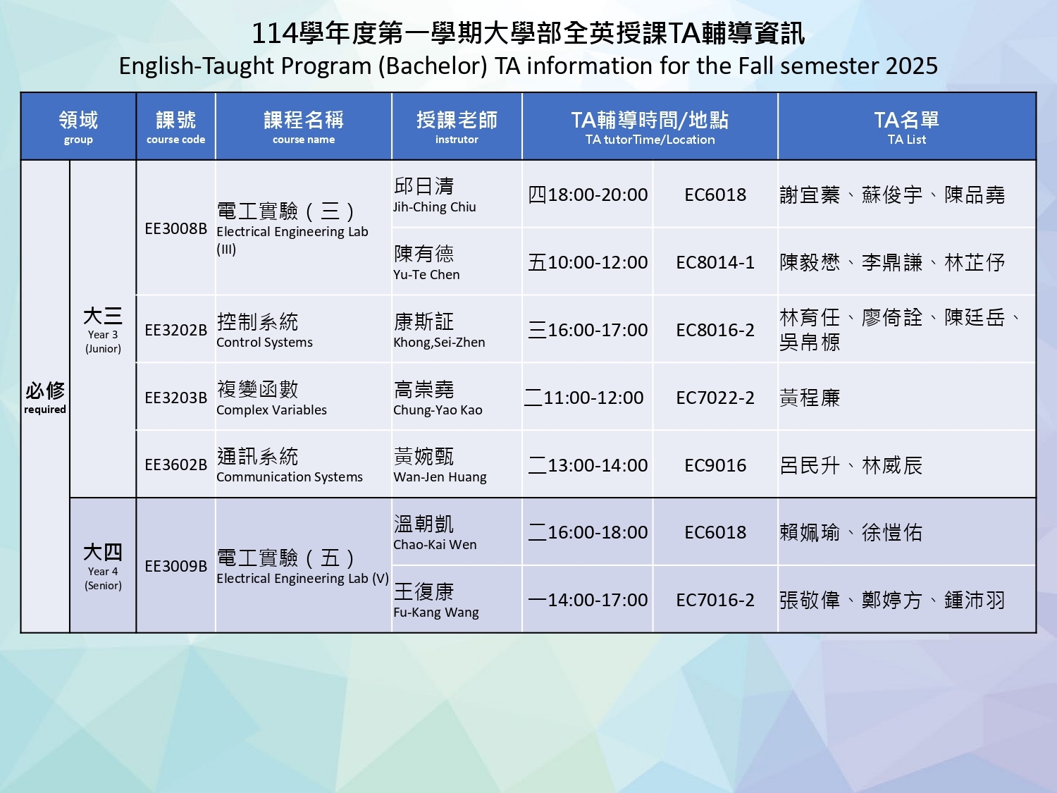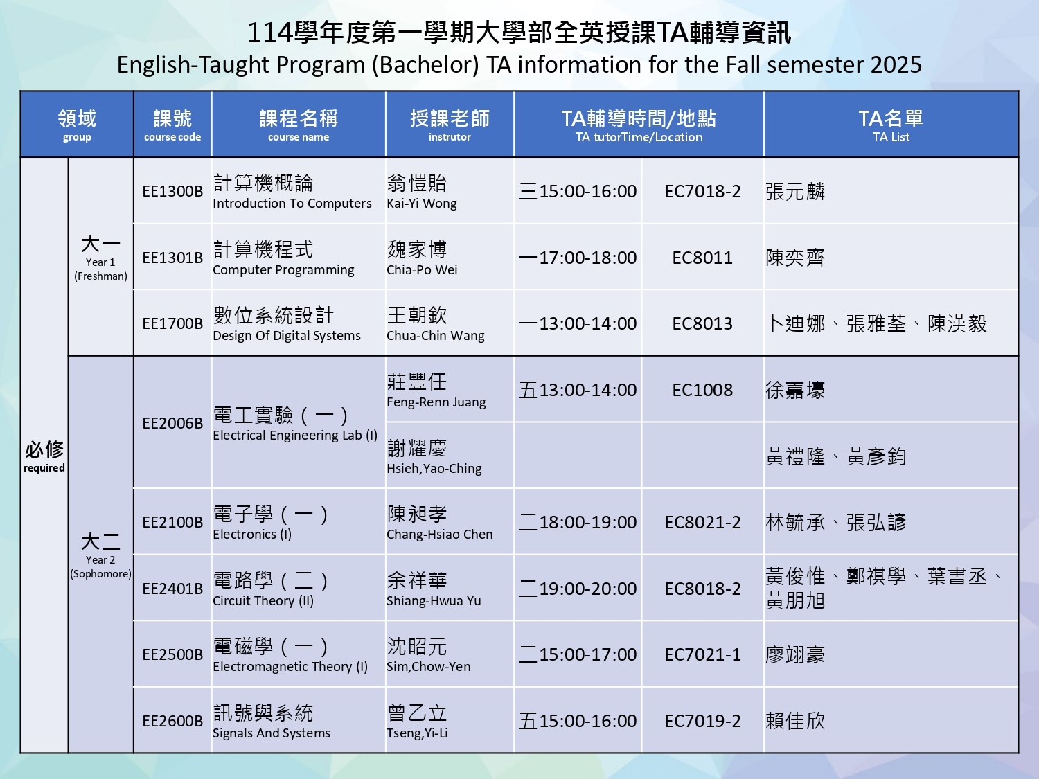 【全英班】114學年度上學期全英授課TA課輔時間 (English-taught Program (Bachelor) TA information for the fall semester 2025)