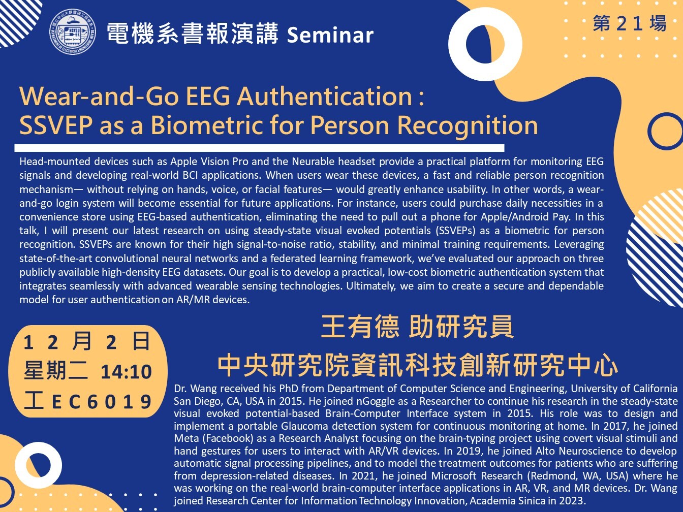 【書報公告】(第21場) 114.12.02(二)中央研究院資訊科技創新研究中心 王有德助研究員 | EC6019
