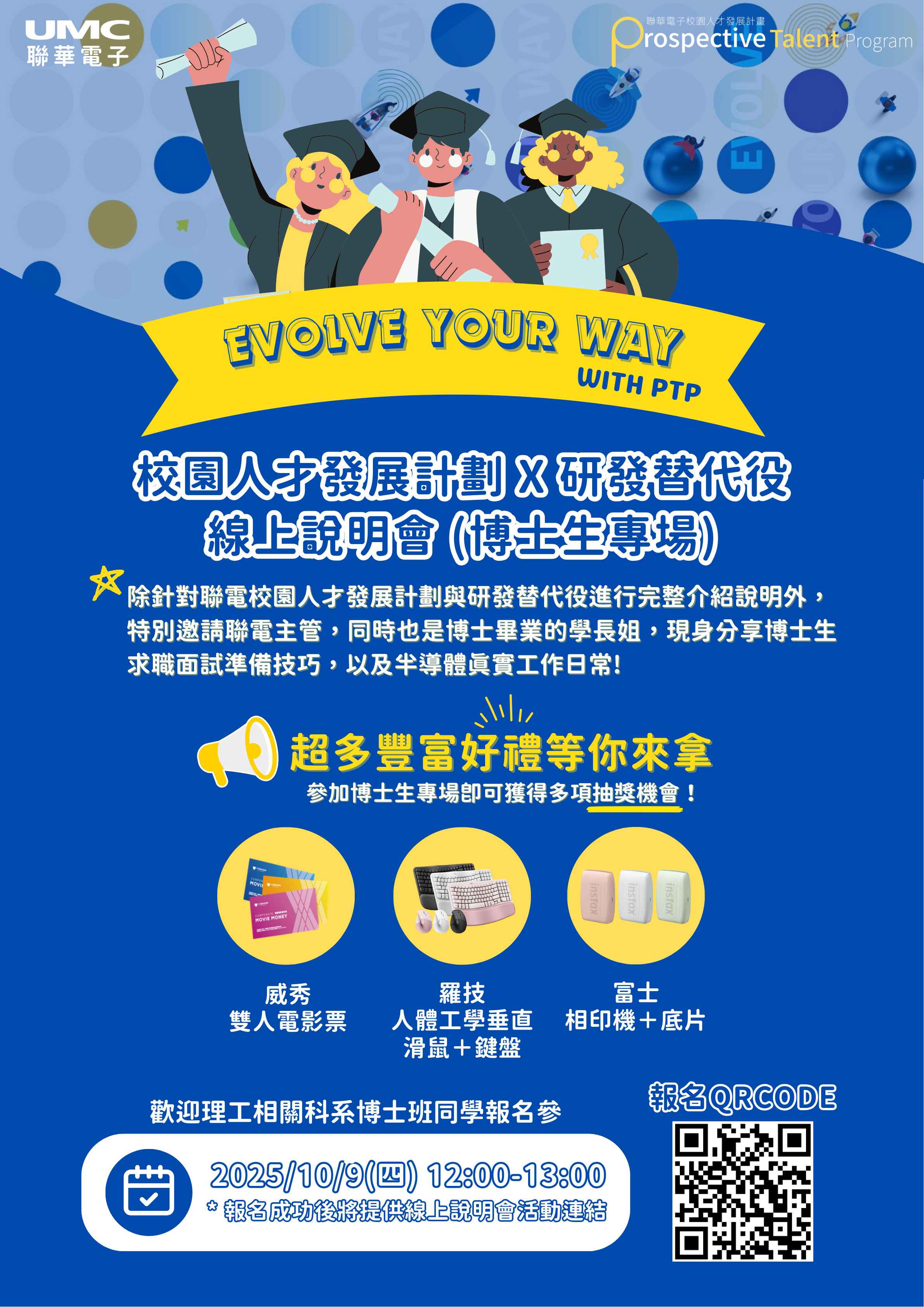 「聯電-校園人才發展計畫及2026年研替說明會,博士生專場」。這是一場專為博士生打造的線上說明會,將於 2025年10月9日(星期四)12:00-13:00 線上舉行