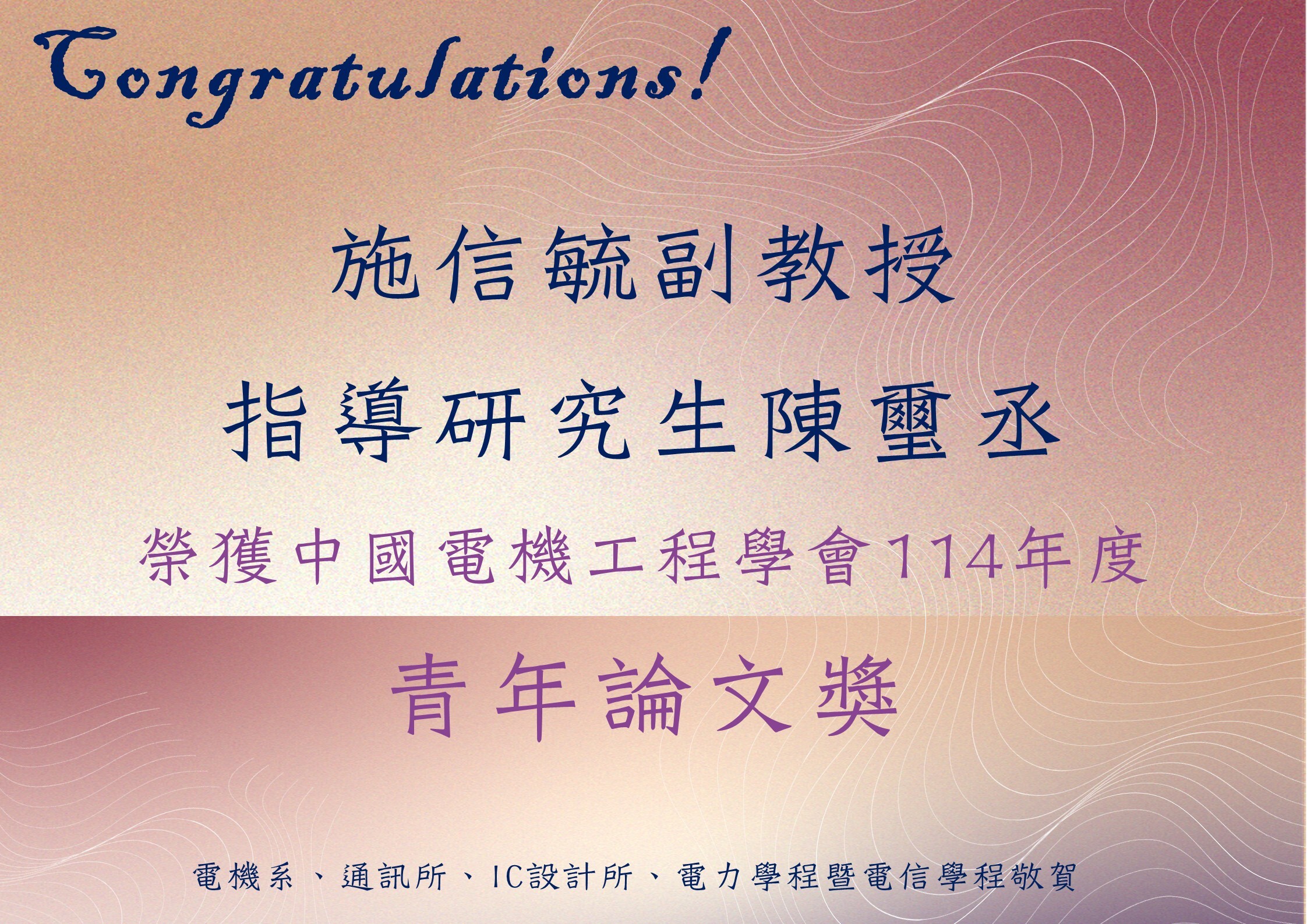 📢恭賀!施信毓副教授指導陳璽丞同學榮獲 中國電機工程學會114年度「青年論文獎」