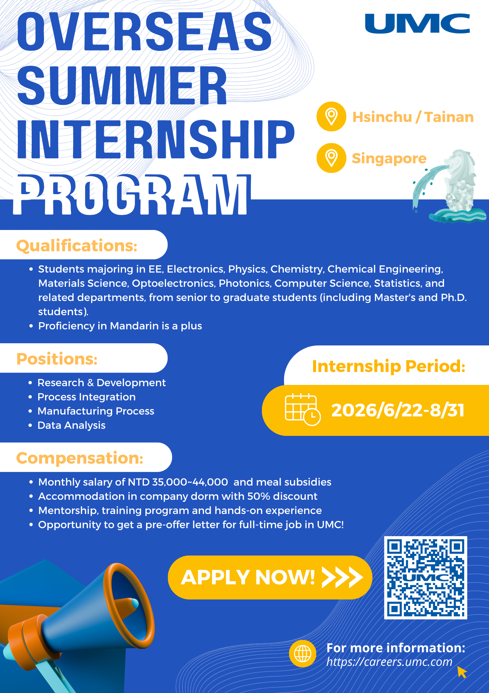 聯華電子 『2026年海內外暑期實習菁英計畫』現正招募中!