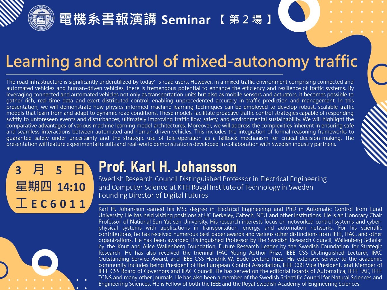 【書報公告】(第02場) 115.03.05(四)14:10 Prof. Karl H. Johansson, KTH Royal Institute of Technology in Sweden | 工EC6011 (English Seminar)