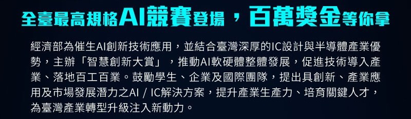 本競賽由經濟部產業技術司主辦,設置「AI應用」與「IC設計」兩大類別,鼓勵學生將 AI 技術實際應用於產業或生活場域,並善用GitHub等國際開源資源,提出符合在地需求並具創新性與產業應用潛力的AI作品,促進AI技術落地,推動AI應用於百工百業。