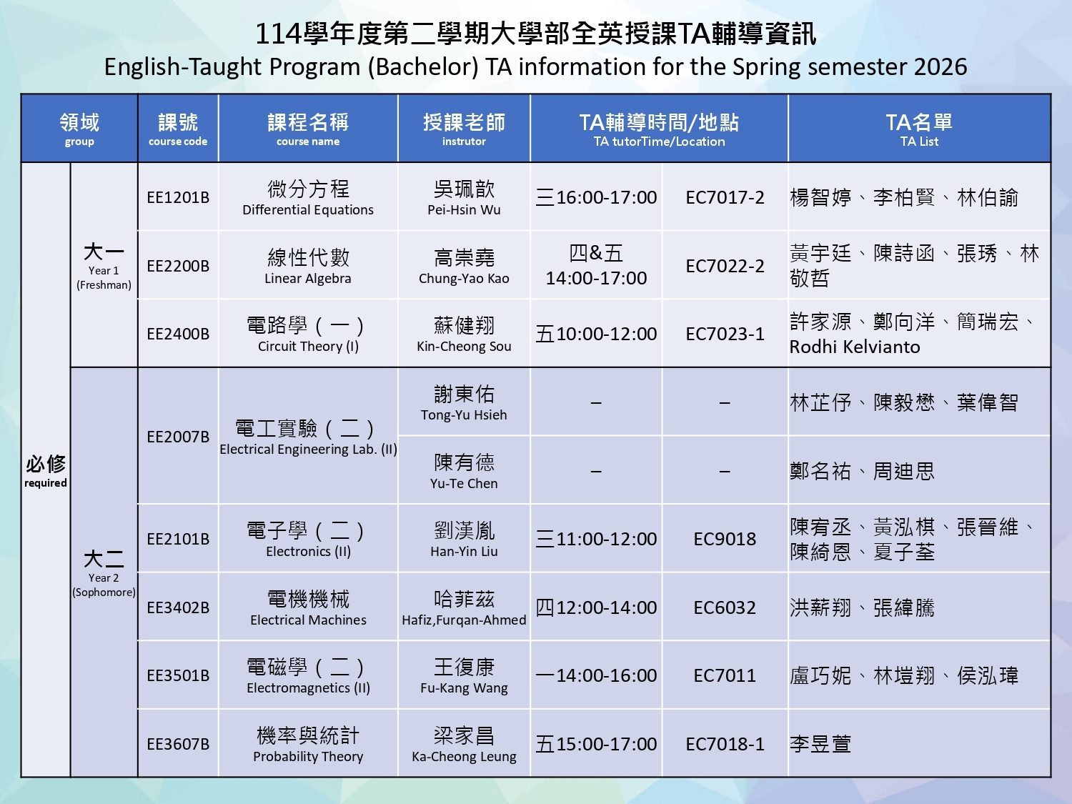 【全英班】114學年度下學期全英授課TA課輔時間 (English-taught Program (Bachelor) TA information for the Spring semester 2026)