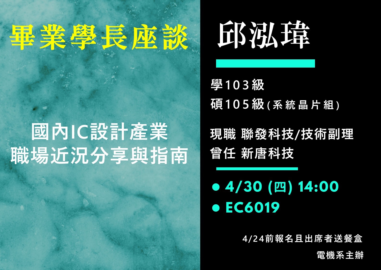 【畢業學長座談】115/04/30(四)14:00 學103/碩105 邱泓瑋系友座談(EC6019)