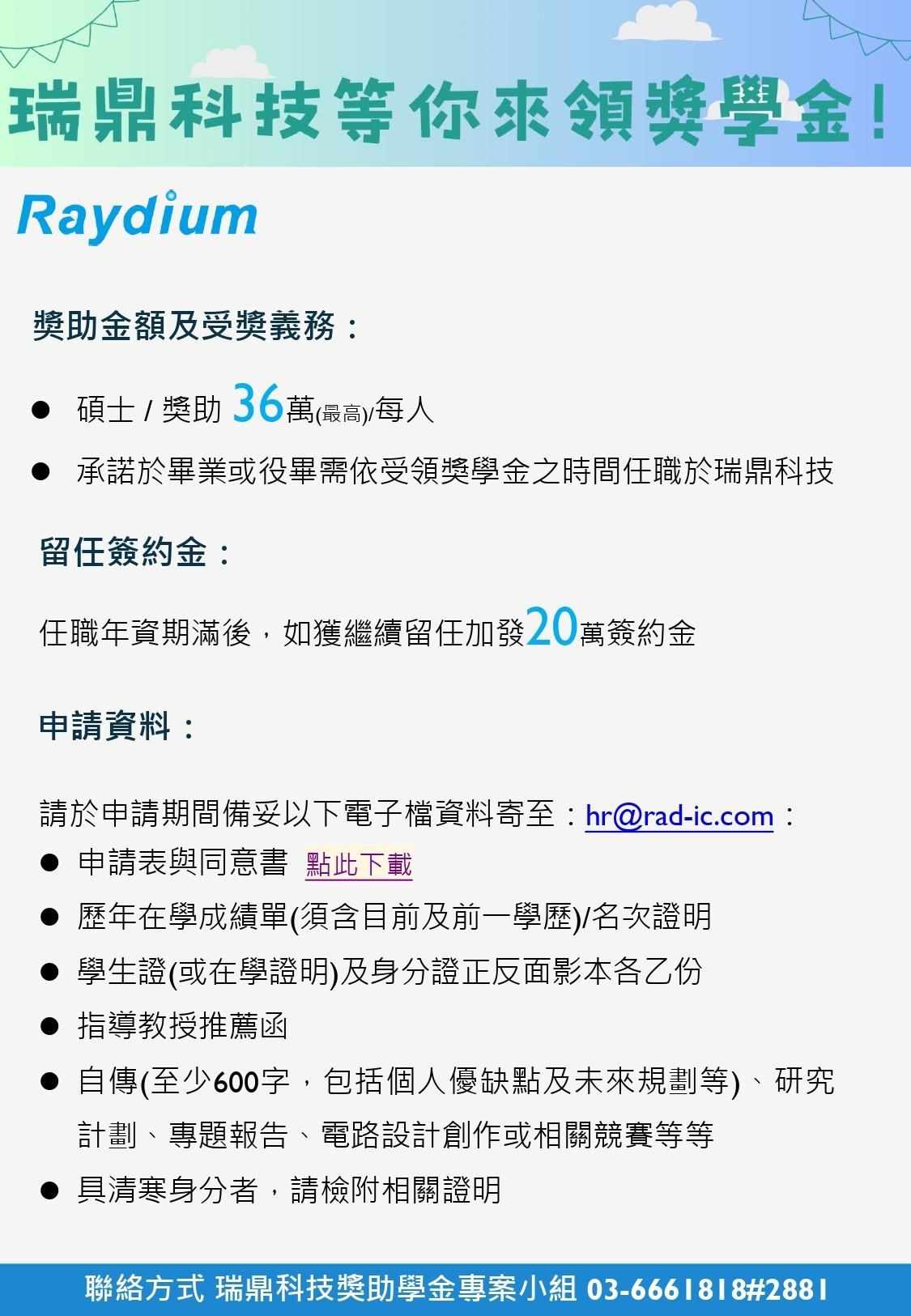 申請資料:請於申請期間備妥以下電子檔資料寄至:hr@rad-ic.com